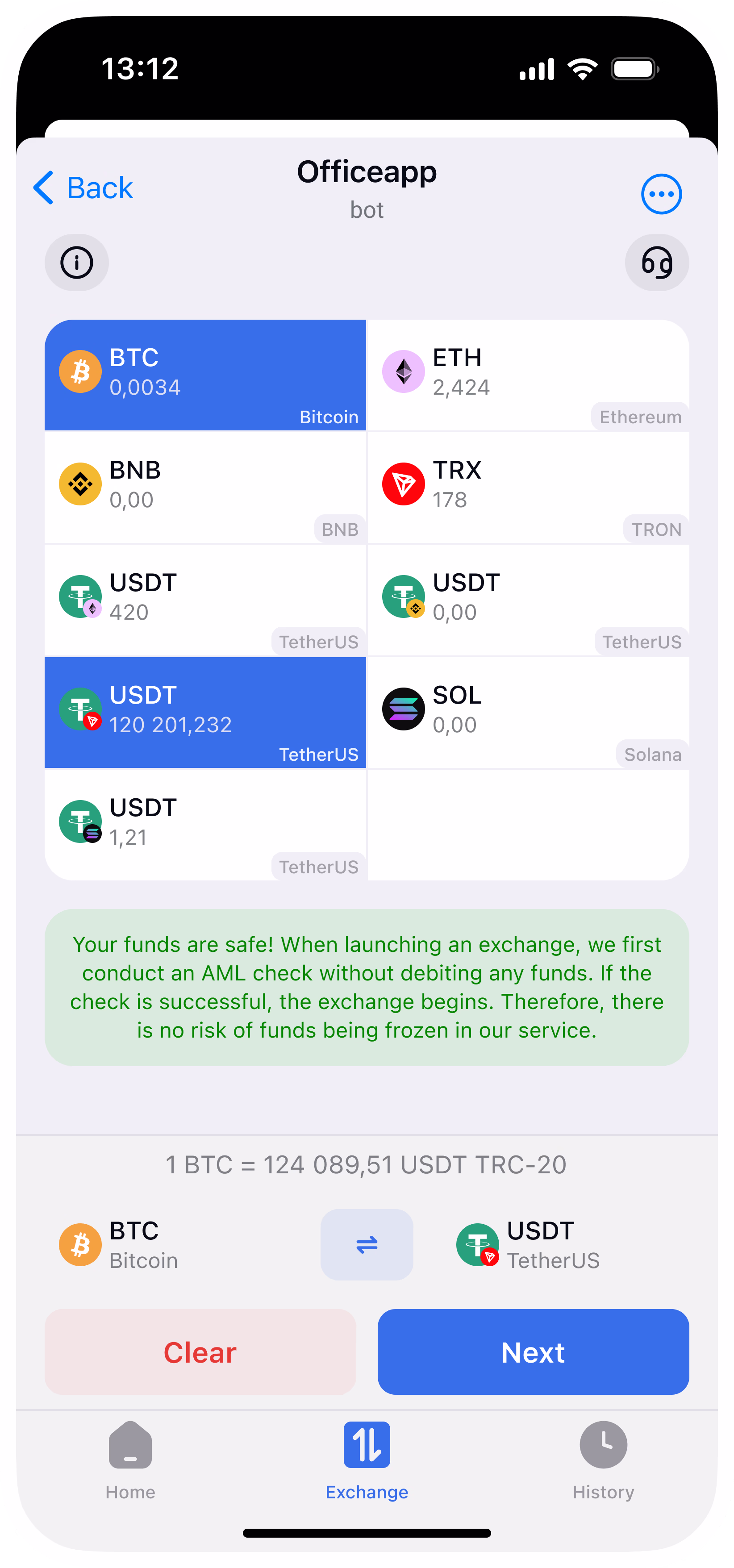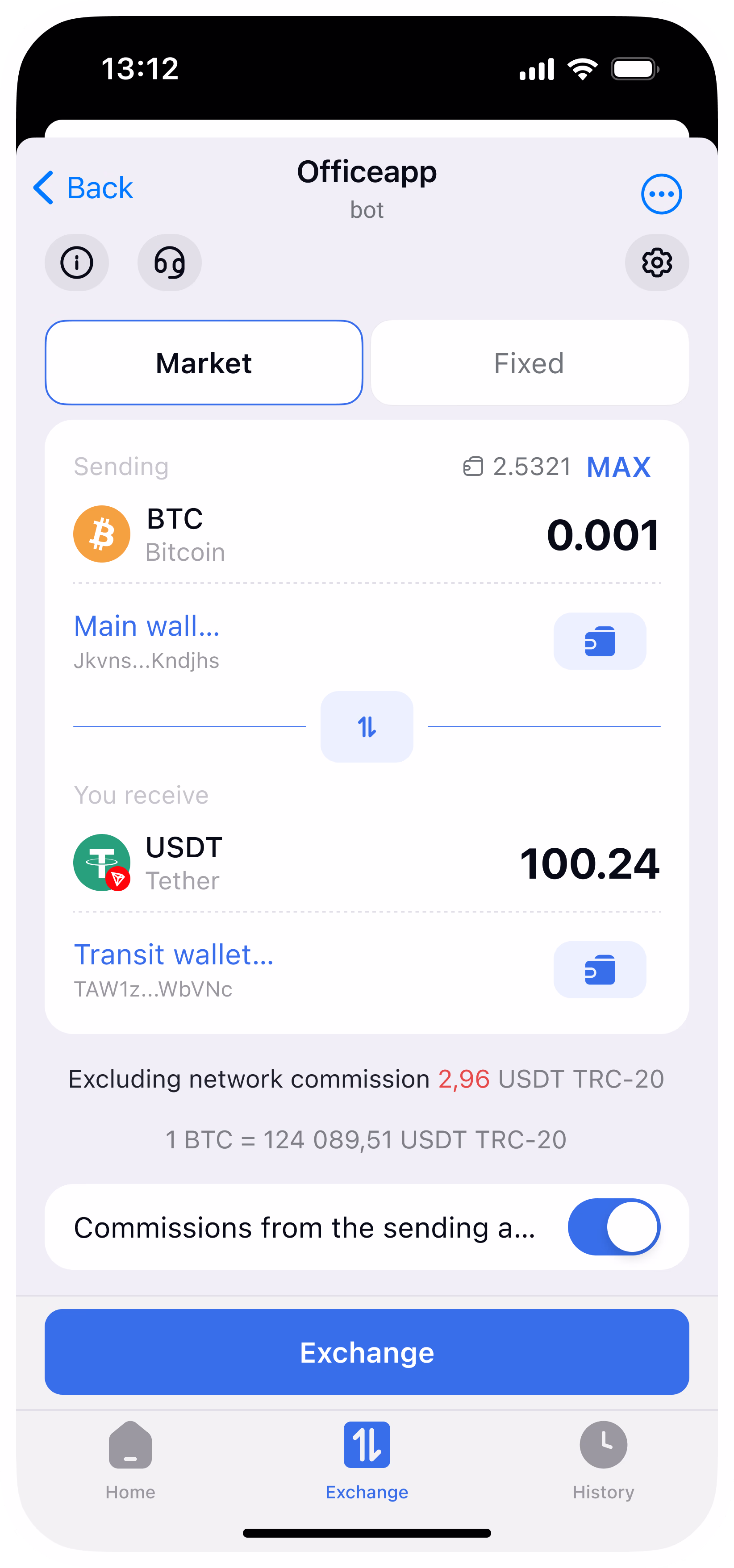 Every step is recorded not only in your Crypto Office account history but also in the blockchains of the tokens selected during the exchange. You can see the details of any transaction after transfers from different networks: transaction hash, status, number of confirmations, fees, and receive notifications directly in Telegram.